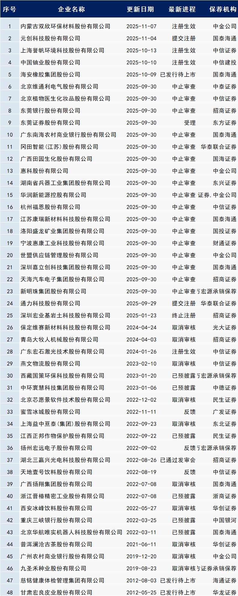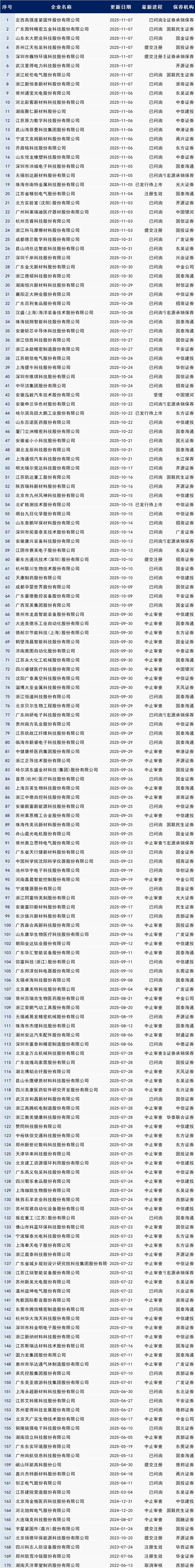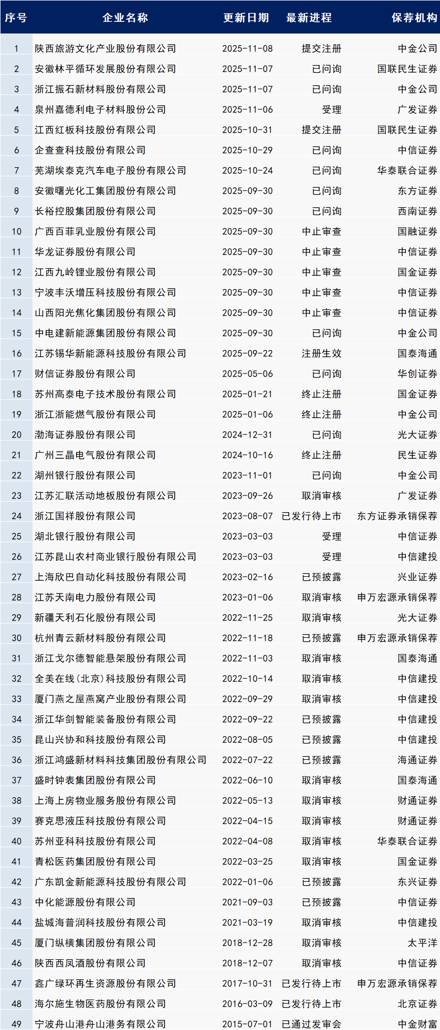 部分进程暂未列入,如有需要可留言:已过会、已上市、终止审查、不予核准、不予注册、终止注册。
