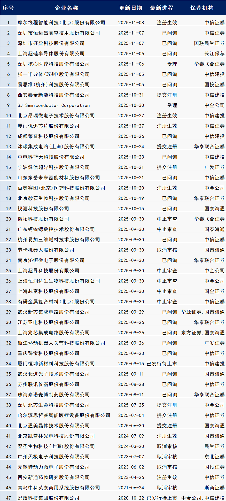 以下最新IPO进程中包含:已预披露、受理、已问询、已发行待上市、暂缓表决、中止审查、反馈、已通过发审会、提交注册、注册生效。